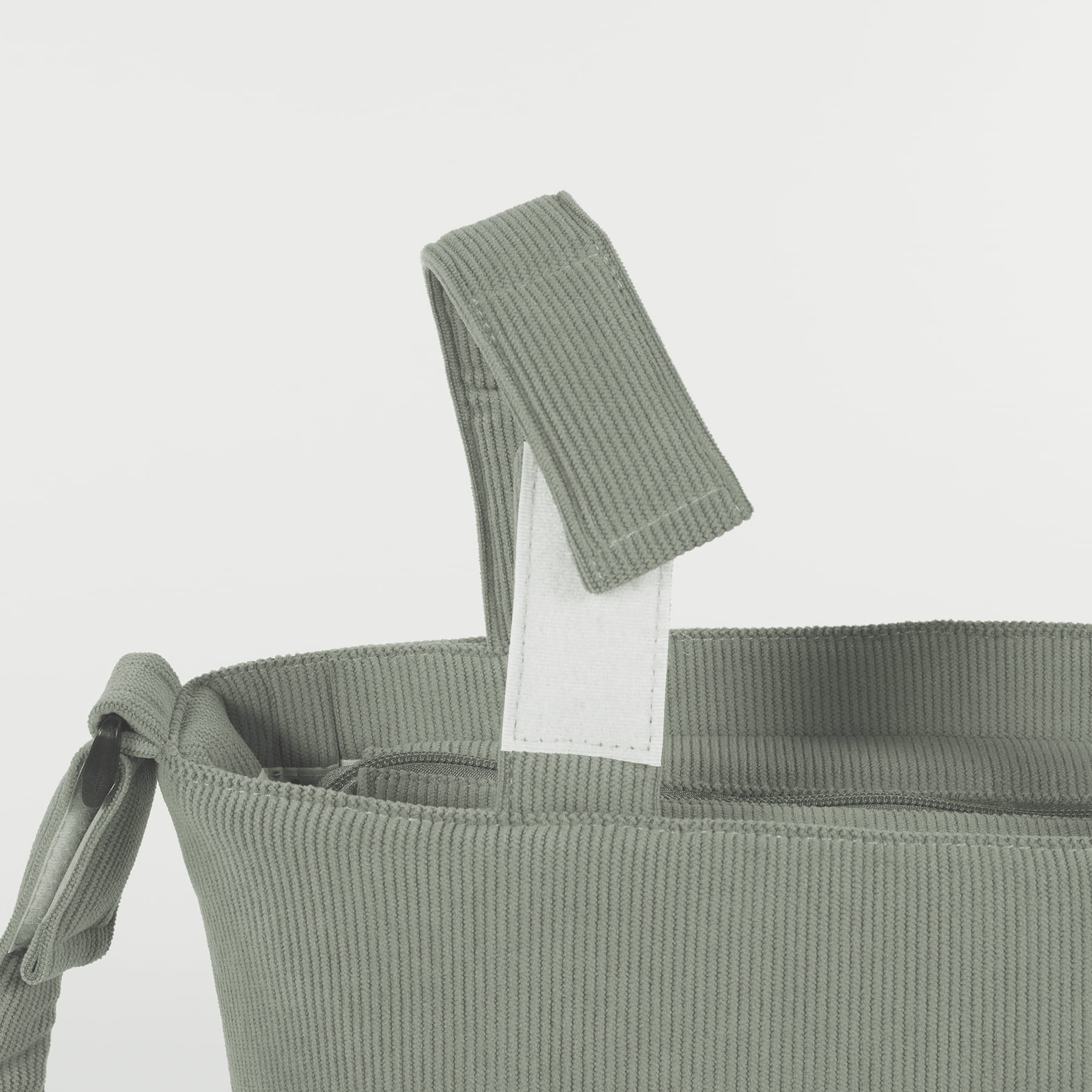 Bolso cambiador Gala Mint de pana para silla de paseo que incluye cambiador para bebe. Bolsa canastilla muy ligera, resistente y de gran capacidad para llevar todo lo necesario para el paseo del bebe. Tiene multiples bolsillos para poder tener todo ordenado. En el interior incopora un bolsillo plastificado para la ropa húmeda, un bolsillo térmico para biberones y dos bolsillos para lo que necesites tener más a mano. La bolsa tiene un sistema universal de fijación, con 2 asas cortas que facilita la colocación en la silla de paseo. También incorpora una asa larga para poder colgarla en el hombro .