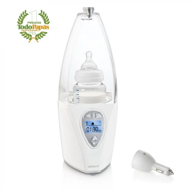 Te permite calentar y esterilizar biberones de forma natural utilizando vapor de agua a alta temperatura. También permite calentar leche materna, esterilizar accesorios o descongelar. Además, calcula automáticamente el tiempo de funcionamiento necesario a partir de la temperatura inicial, el tipo y el volumen de alimento que desees preparar para conseguir un calentamiento rápido, uniforme y a la temperatura apropiada. Incluye también adaptador para usar en el coche.
