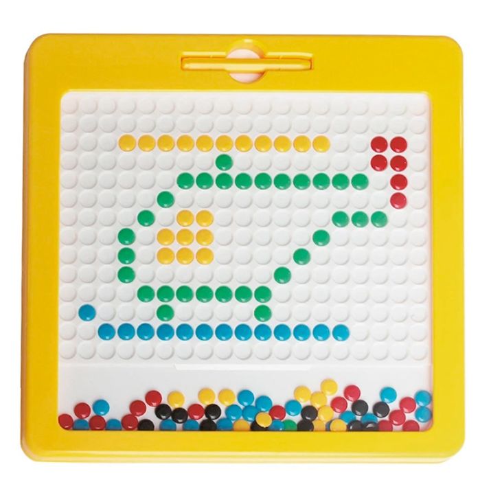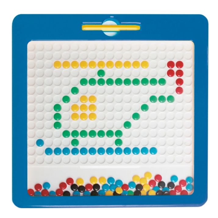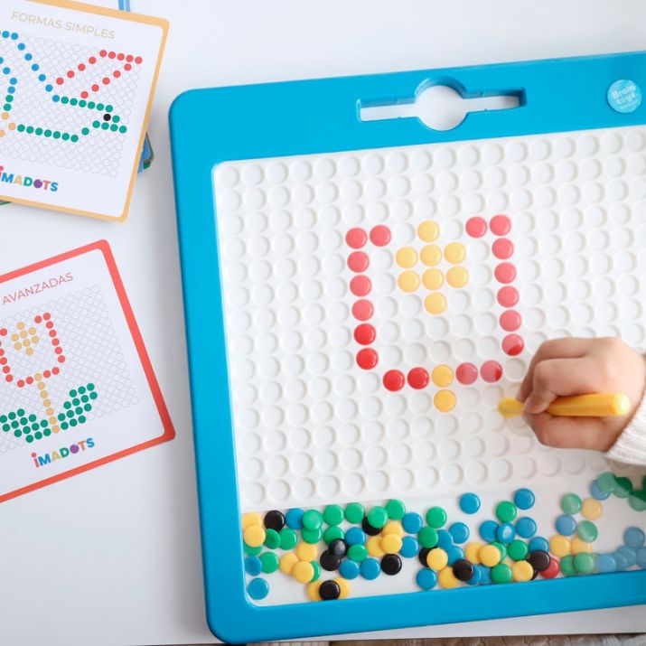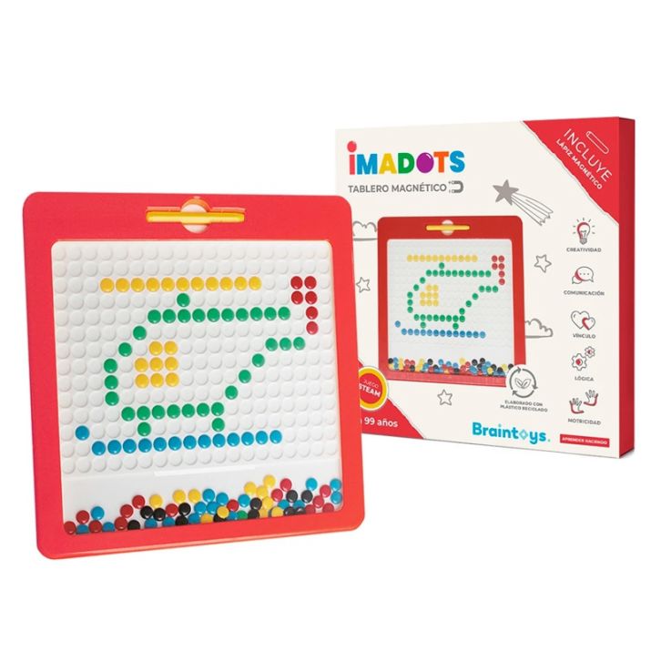 Imadots es un llamativo tablero cuyo interior contiene fichas de colores variados que, al ser arrastradas con el lápiz imantado, permiten trazar formas y dibujos variados.