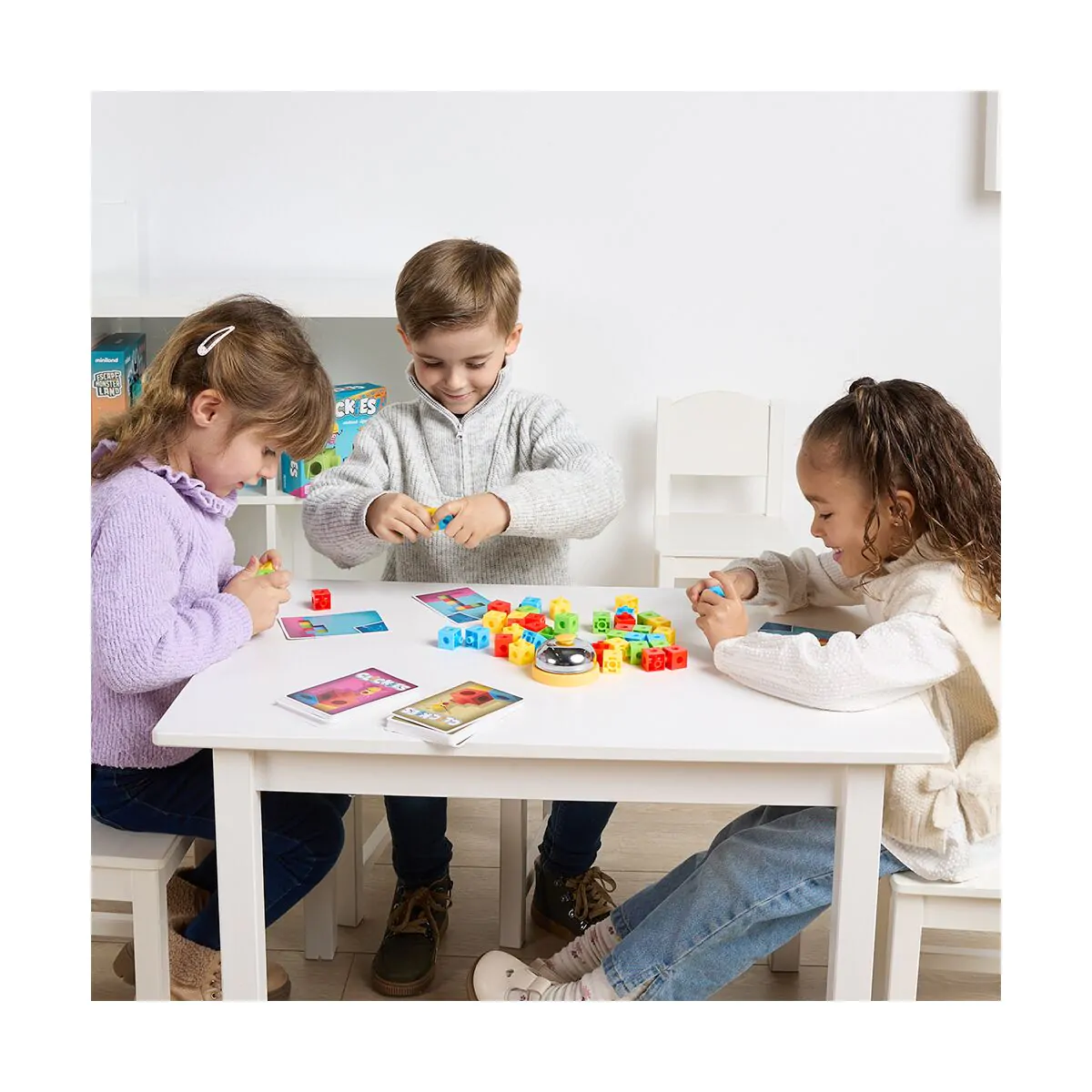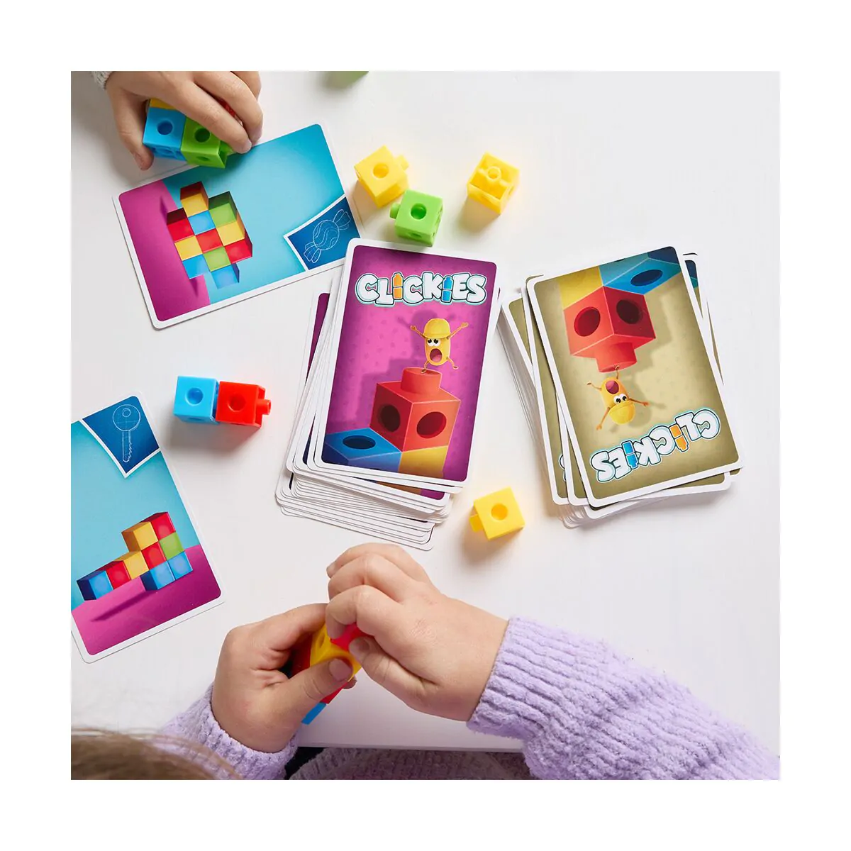 Clickies es un emocionante juego de mesa que desafía a los jugadores a usar su creatividad, destreza y rapidez para construir estructuras únicas con policubos de colores. Cada partida comienza con una carta de desafío que indica la figura a construir. Los jugadores compiten contrarreloj para completarla, y el primero en lograrlo toca el timbre central, añadiendo emoción y dinamismo al juego.