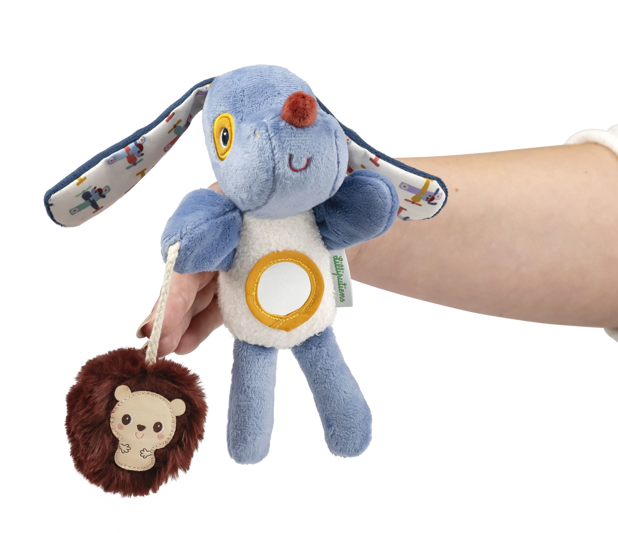 ¡Jules el perrito cobra vida cuando lo animas con los dedos! Emite un suave sonido de sonajero que despierta al bebé con dulzura.