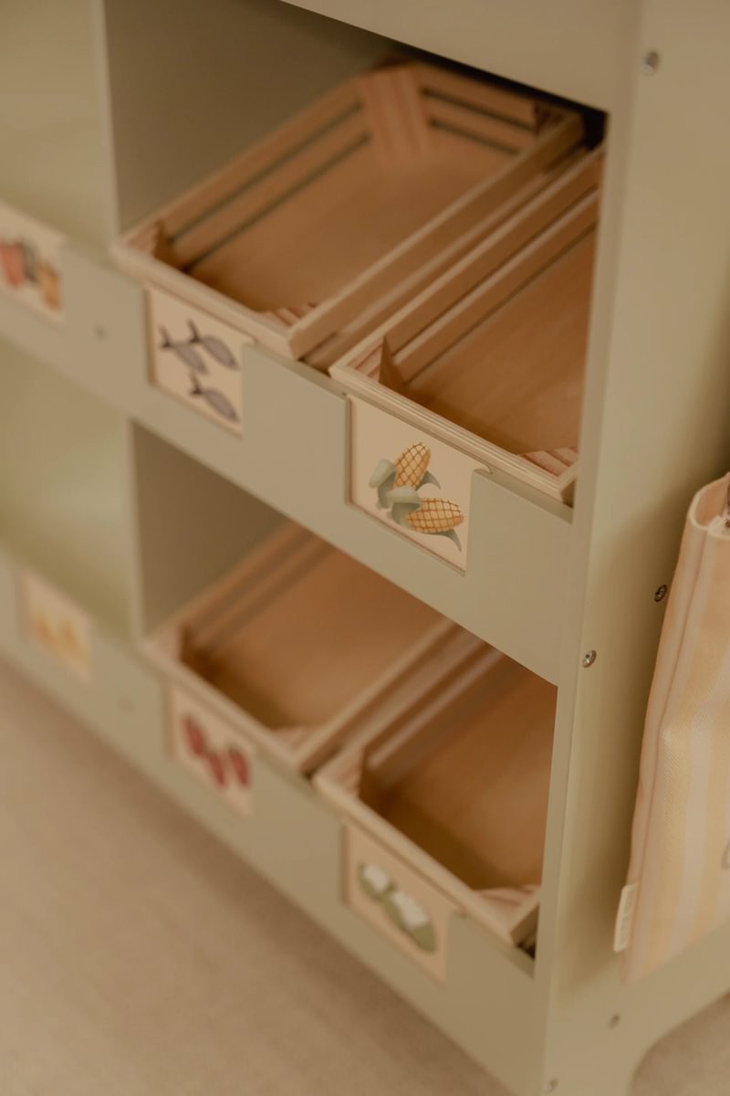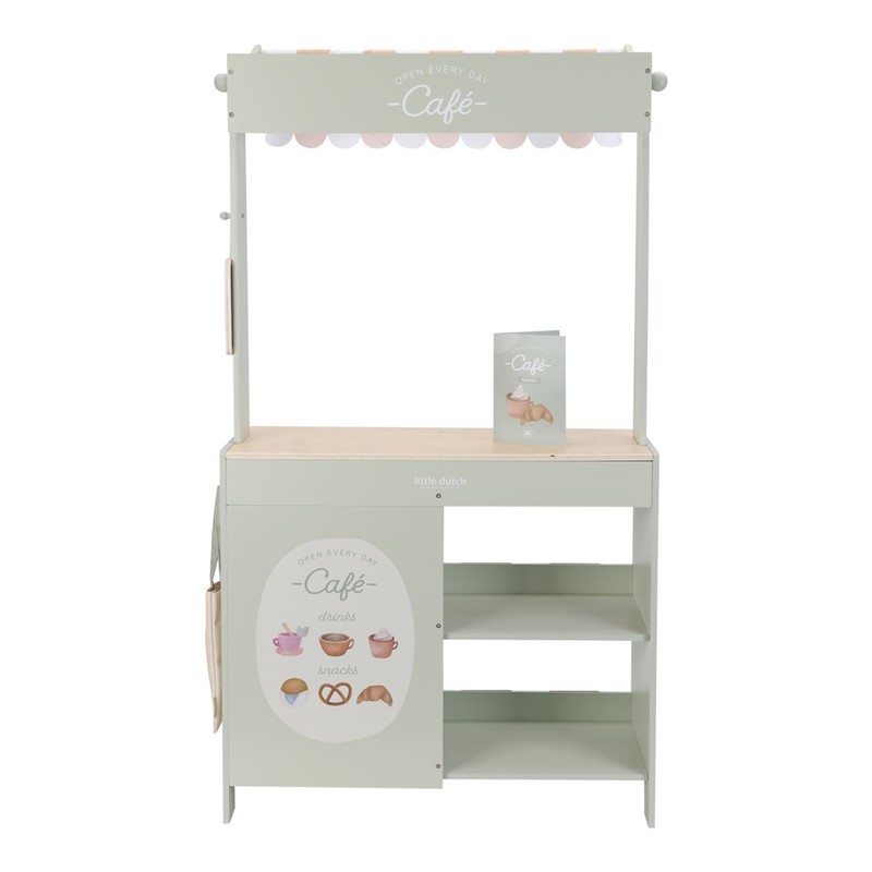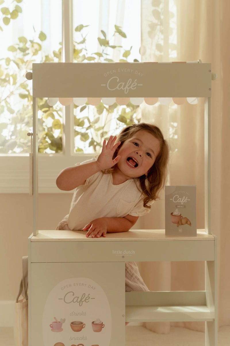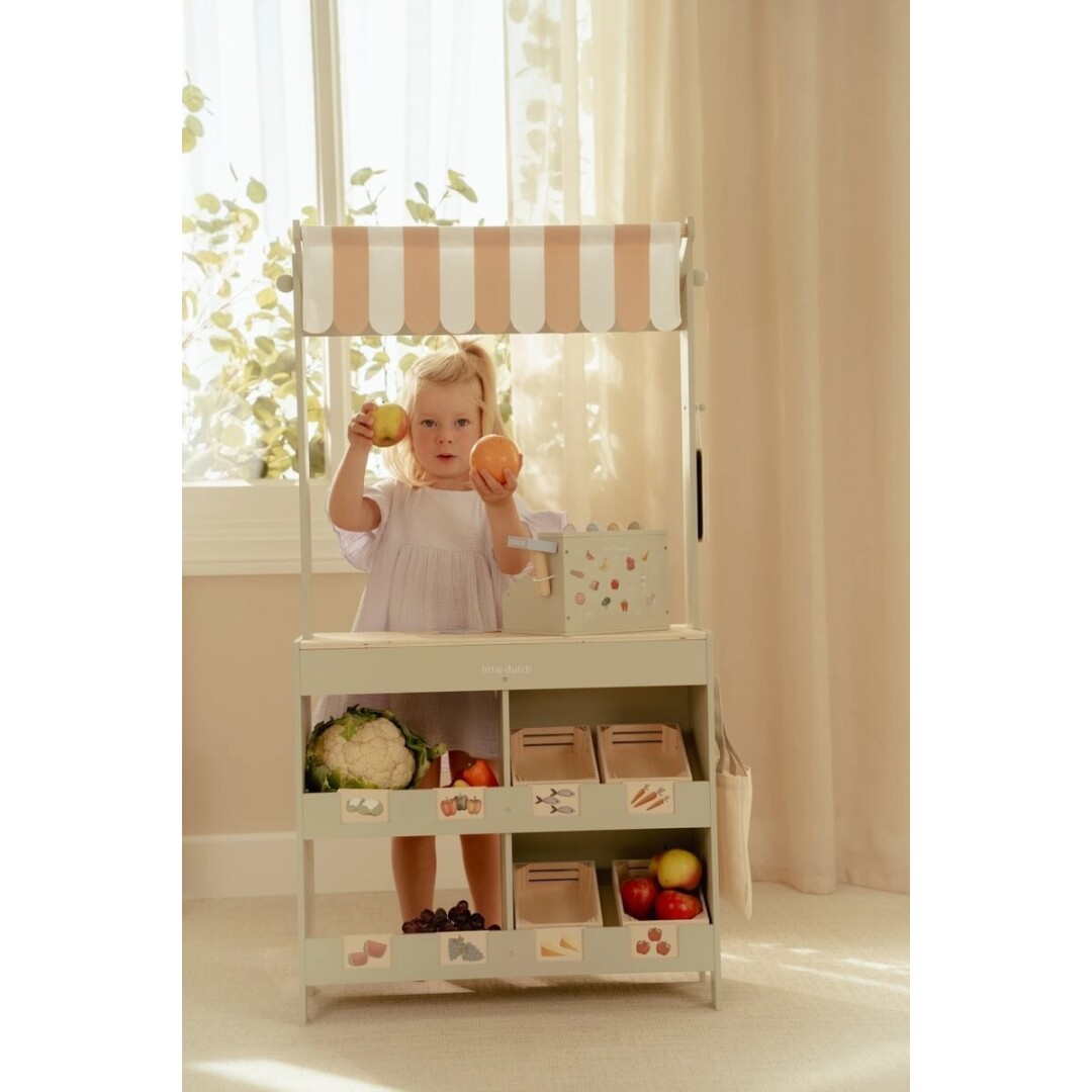 ¡Bienvenidos al mercado! Con este precioso puesto de madera, los niños pueden jugar a comprar en su propia tiendita. La marquesina de tela crea un auténtico ambiente de mercado, y con la pizarra y las tarjetas ilustradas, pueden exponer sus productos con estilo. El set también incluye una bolsa de la compra y cajas para una auténtica experiencia de compra. Dale la vuelta al puesto y se convierte en una cafetería, con menú y alegres ilustraciones. Combínalo con la caja registradora, la báscula o el expositor de pasteles para disfrutar aún más jugando. ¿Qué hay en el menú de hoy?
