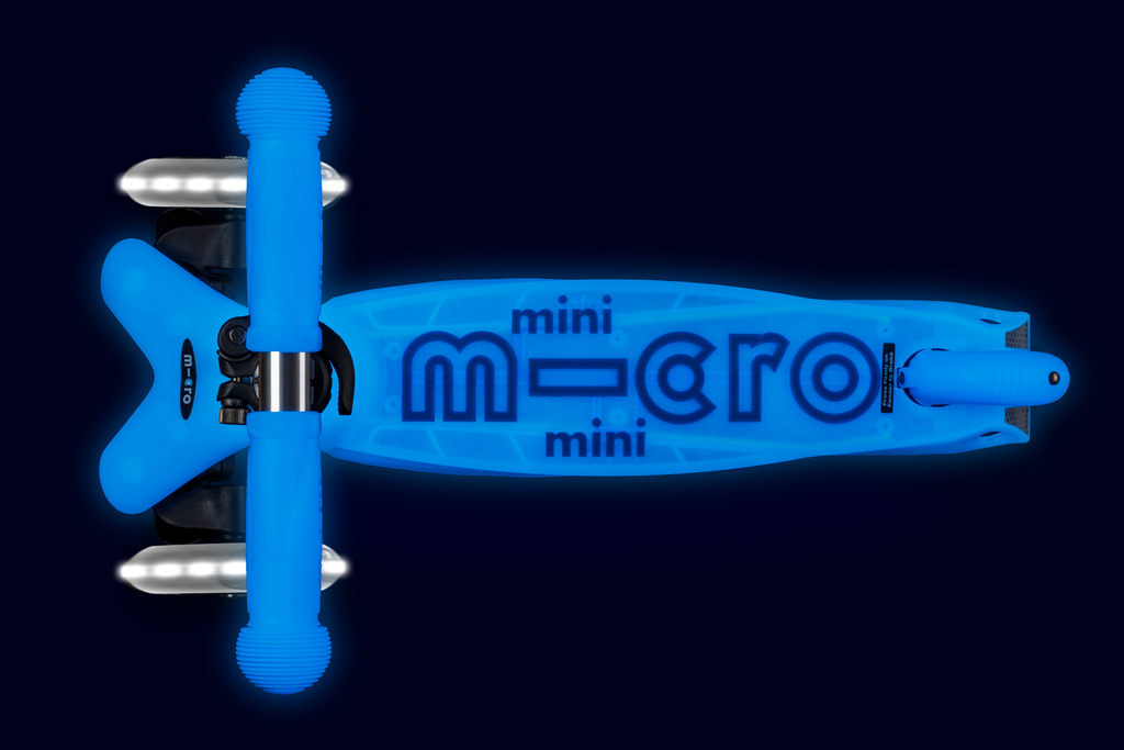 El Mini Micro ha sido elegido numerosas veces juguete del año por padres y madres. Este juguete deportivo no solo fomenta el movimiento y el ejercicio, sino que también ayuda a los niños a mejorar el equilibrio, la coordinación y las habilidades motoras finas. El manillar diseñado en forma de T hace más segura su conducción y dispone de un cierre de seguridad que hace que solo los adultos puedan desmontarlo para guardarlo. Dispone de un sistema de giro por inclinación patentado. La plataforma está fabricada con fibra de vidrio lo cual le otorga resistencia y flexibilidad. Además incluye letras de goma en relieve que son antideslizantes facilitando el manejo del patinete y dando seguridad extra a nuestros pequeños. Incorporan unas ruedas LED que funcionan a través de una dinamo, por lo que no requieren de baterías, sino que funcionan solo cuando nos movemos. Emiten una brillante luz blanca que, además de ser divertida para nuestros pequeños, les da seguridad al ser vistos con mayor facilidad en momentos de oscuridad. Por ultimo y en absoluta primicia, tanto la plataforma como los puños y el logo del manillar brillan en la oscuridad. La luz ultravioleta del ambiente diurno carga esos componentes y al llevarlos a la oscuridad hacen que el patinete que de día tiene un tono pastel adquiera un tono neon brillante