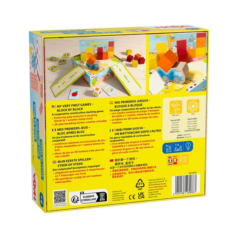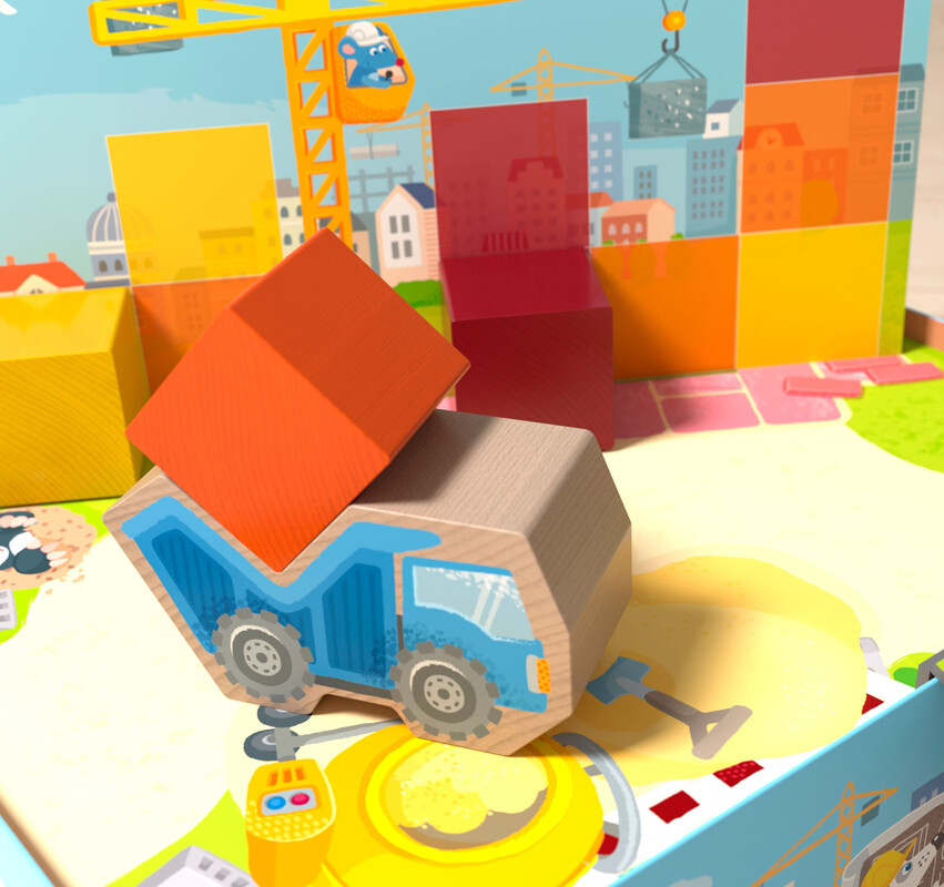 ¡En las casas de Haba no paran de suceder cosas! Se construye en todos los rincones. Planta a planta, bloque a bloque, se van alzando nuevas casas. ¡Toca arremangarse y echar una mano! Los niños/as acercan con el camión volquete los bloques de construcción.