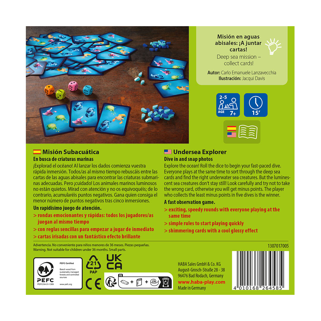 Juego de observación y cálculo en el que los jugadores/as a la vez deberán coger cartas de la pila con el objetivo de reunión el número de criaturas submarinas indicadas en los dados. Gana quien logre acumular menos puntos negativos al final de 5 rondas. Permite variante de juego de memoria.