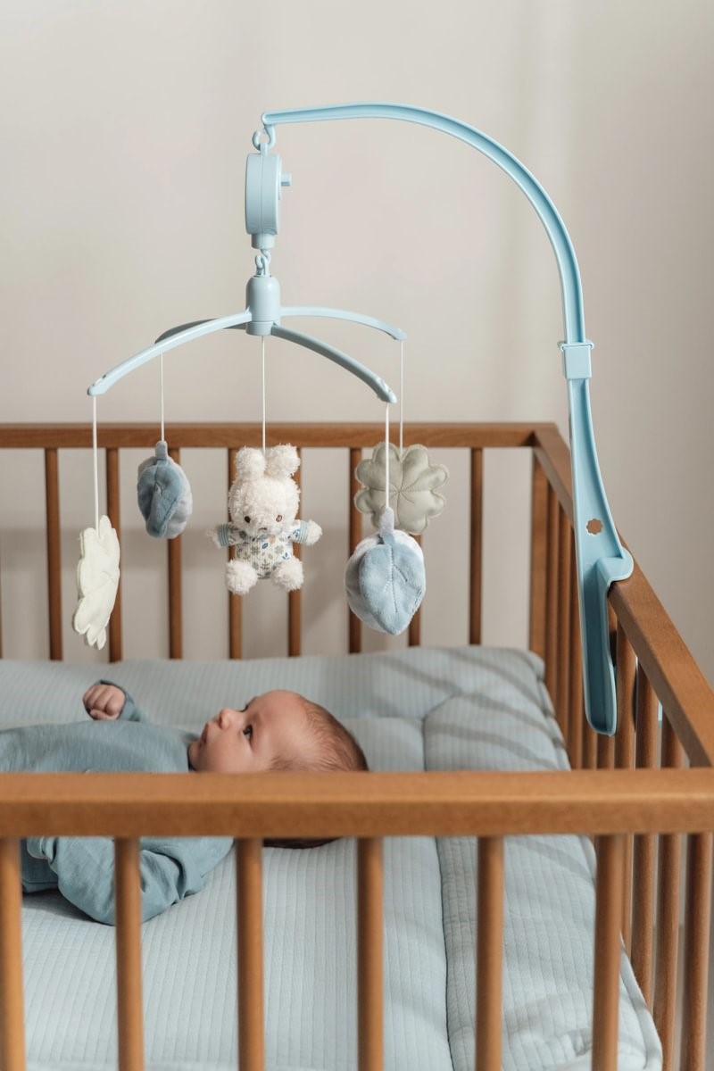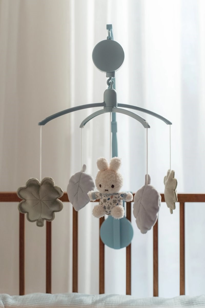 ¡Sigue a Miffy mientras suena la canción! Está rodeada de flores del diseño Lucky Blossom de Little Dutch. Mientras los tréboles de cuatro hojas y las flores rodean a Miffy, la dulce música te tranquiliza. Un entretenimiento encantador para tu pequeño que estimula el desarrollo visual. El móvil musical es adecuado desde el nacimiento y se puede colocar fácilmente en una cuna o un corralito.