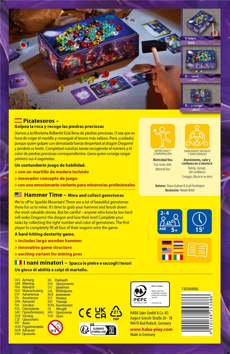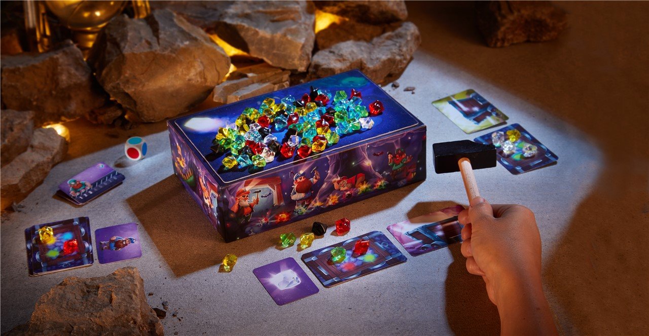 Los jugadores/as deben conseguir valiosos tesoros golpeando la caja con el martillo, para así lograr los números y colores de piedras indicados en las cartas de vagoneta. Si se golpea muy fuerte y se hacen caer demasiadas piedras, se pierde el botín y el turno. Gana quien consiga cargar primero sus 4 vagonetas con piedras preciosas.