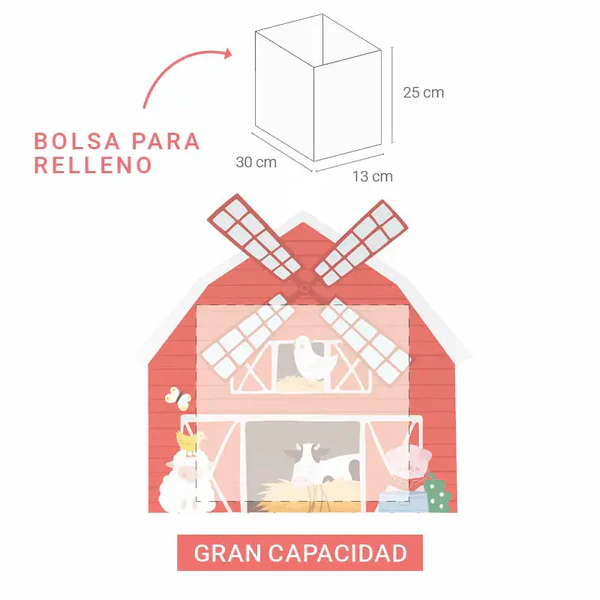 Esta piñata con forma de granero forma parte de la colección Granja. La piñata mide 39,5cm de ancho por 42cm de alto, y cuenta con gran capacidad para rellenar de juguetes y regalos sorpresa.