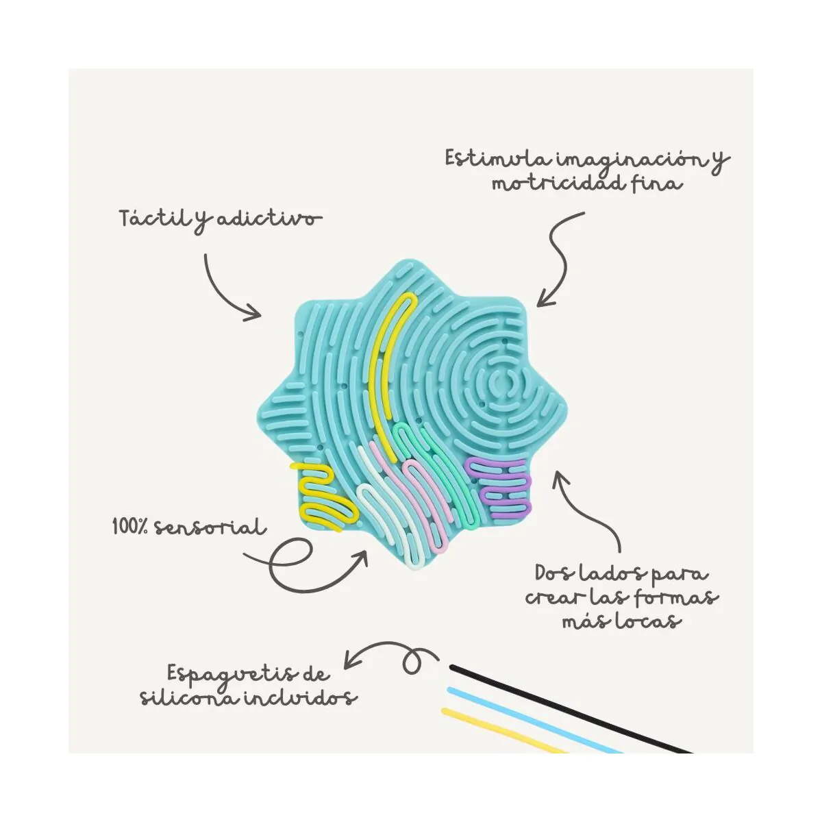 El Fidget de silicona Flexhetti Estrella estádiseñado para que los más pequeños desarrollen sus habilidades motoras y sensoriales de forma divertida. Su superficie estápensada para colocar los fideos de colores en distintas posiciones y combinaciones, lo que favorece el juego libre y creativo desde muy temprana edad.