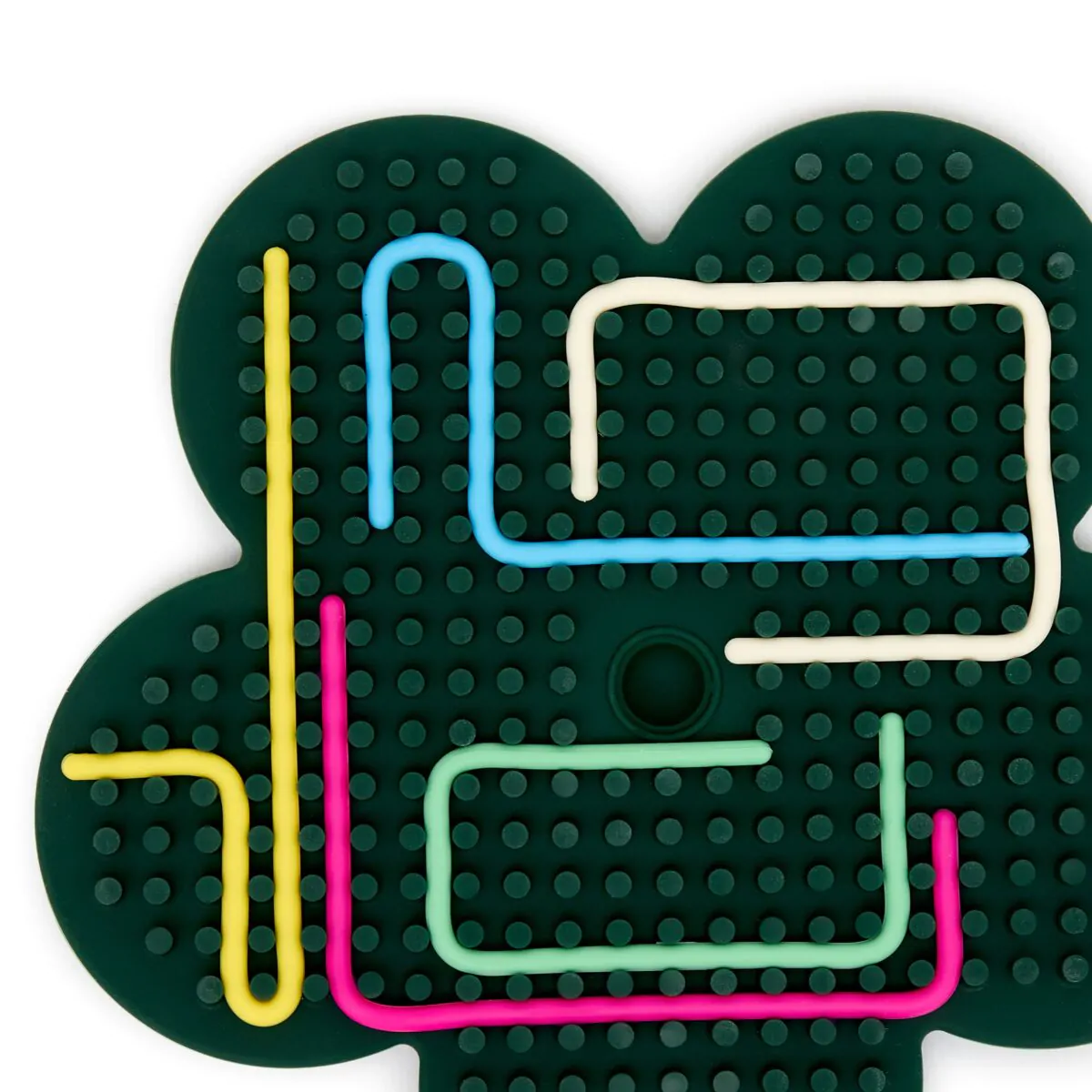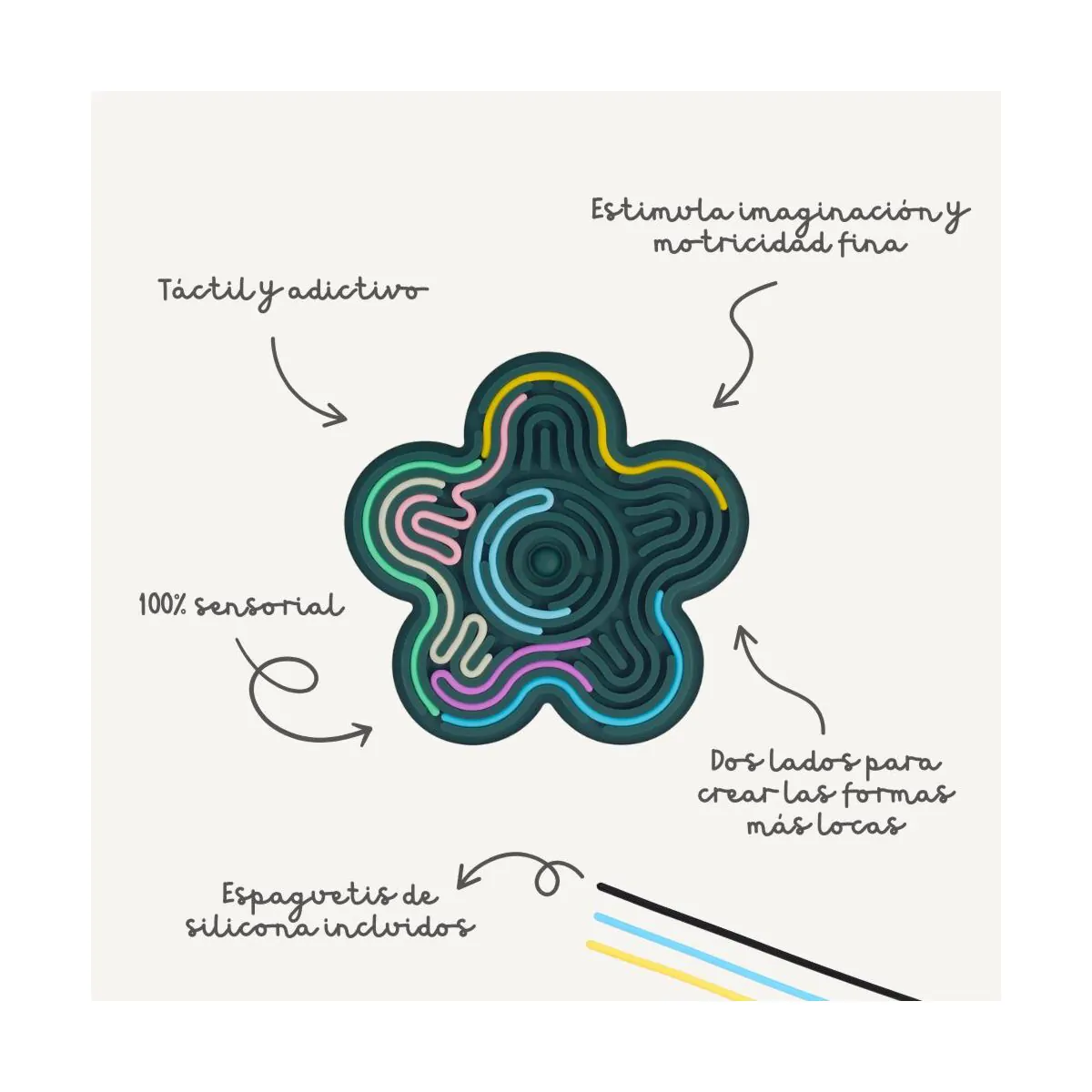 El Fidget de silicona Flexhetti Flor estádiseñado para que los más pequeños desarrollen sus habilidades motoras y sensoriales de forma divertida. Su superficie estápensada para colocar los fideos de colores en distintas posiciones y combinaciones, lo que favorece el juego libre y creativo desde muy temprana edad.