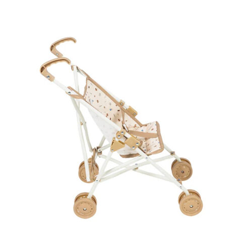 Silla pequeña de paseo plegable en forma de tijera con estampado neutral y con elementos relacionados con la naturaleza. Tiene una estructura metalizada muy resistente que puede plegarse completamente. El muñeco que puede ir en la sillita puede medir entre 30 y 42 cm. La tela del cochecito se retira fácilmente para poder lavar a máquina.