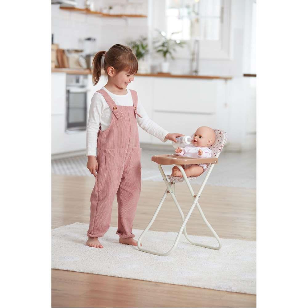 Trona plegable con estampado neutral y con elementos relacionados con la naturaleza. Los materiales son de calidad y estructura de metal. Los peques podrán sentar a sus muñecos para darles de comer. El muñeco que puede ponerse en la trona puede medir entre 36 y 52 cm. Tela fácilmente removible para poder lavar a máquina.