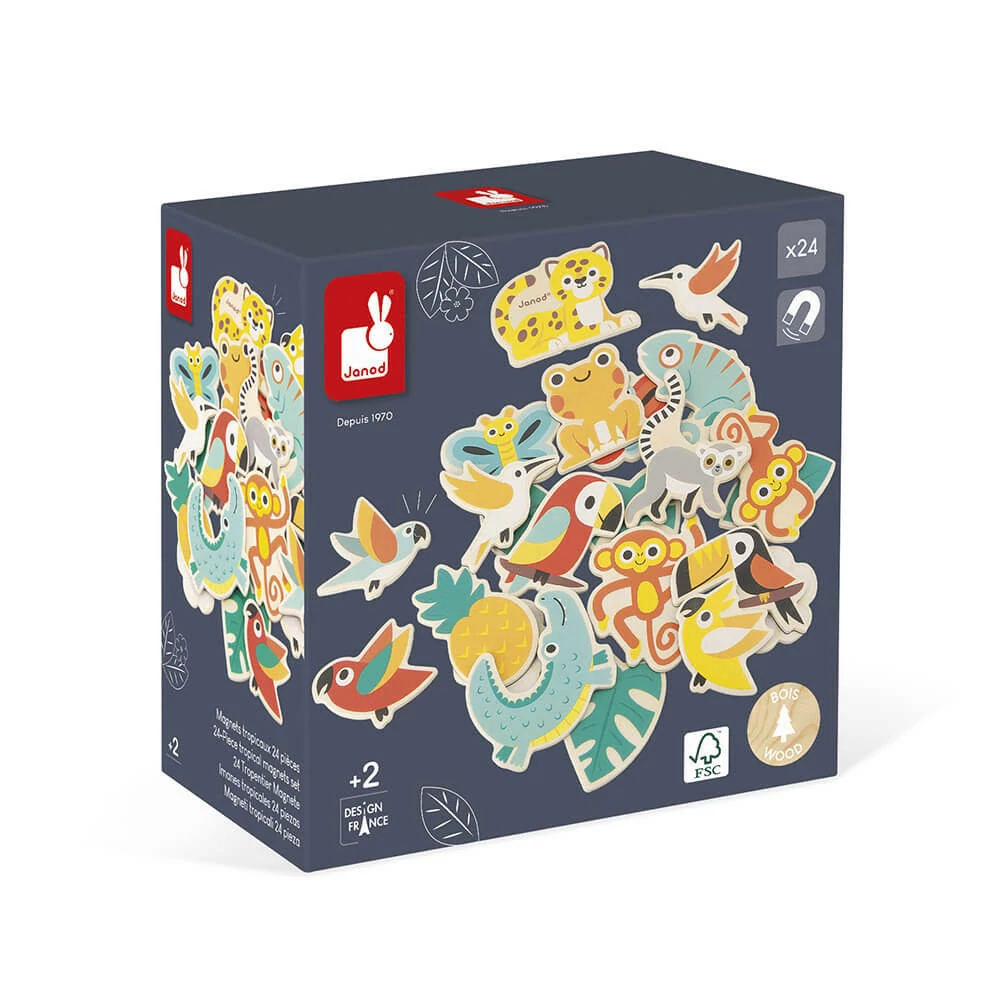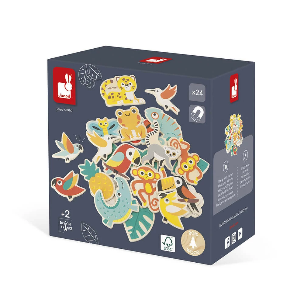 ¿Tienes ganas de evadirte e irte de vacaciones? ¡Dale a todas tus superficies magnéticas un toque exótico con tus 24 imanes de madera! ¡En este set de imanes, encontrarás: loros, cocodrilos, jaguares, camaleones, lémures, monos y muchos más! ¡Imanes perfectos para pizarras infantiles o para el frigorífico, por ejemplo! Para decorar e imaginarse historias en el corazón de la jungla tropical… Este juego de 24 imanes de madera es apto para niños de a partir de 2 años.